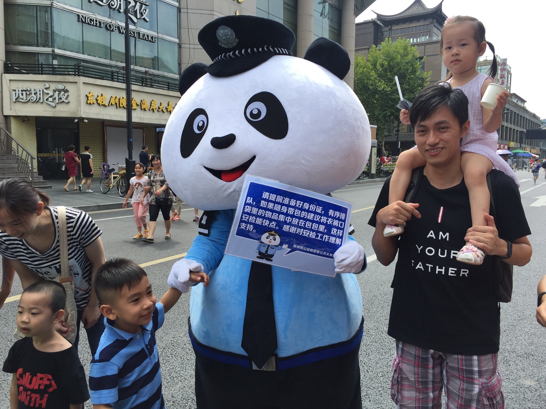 On May 27, 2016, by the entrance to a security checkpoint of the West Lake, a volunteer dressed in a panda costume holds a notice informing people of how to handle their ID cards during the security screening. figcaption >
