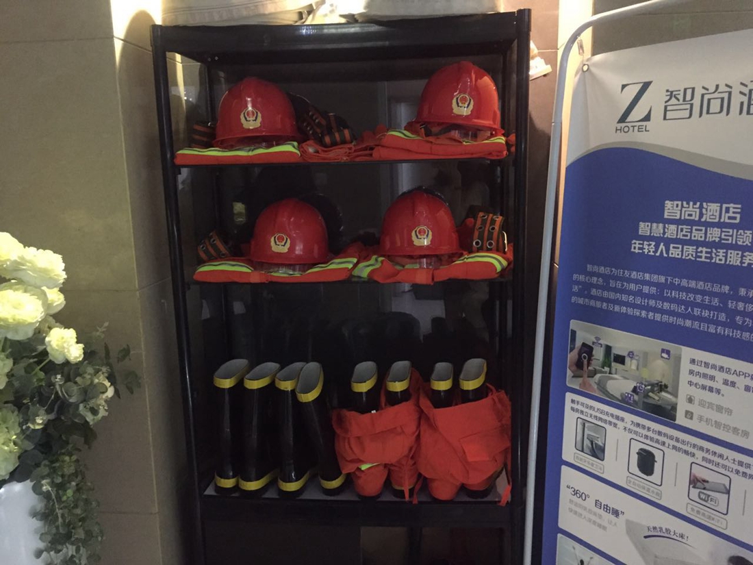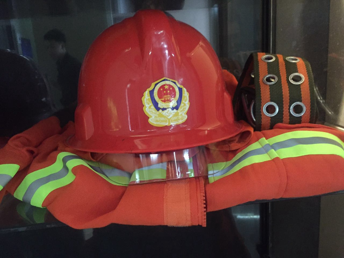 Firefighter uniforms sit neatly on a shelf next to the elevator in a local hotel. figcaption >