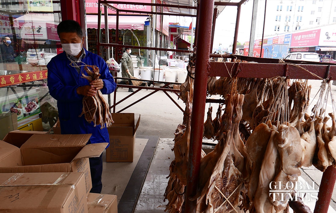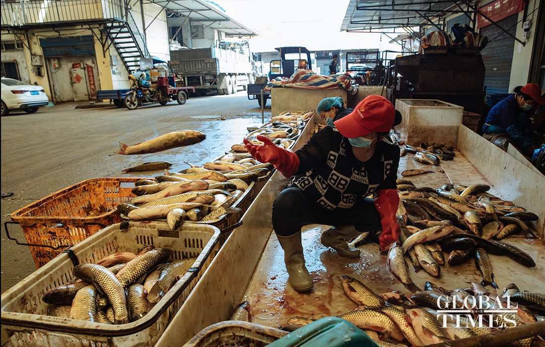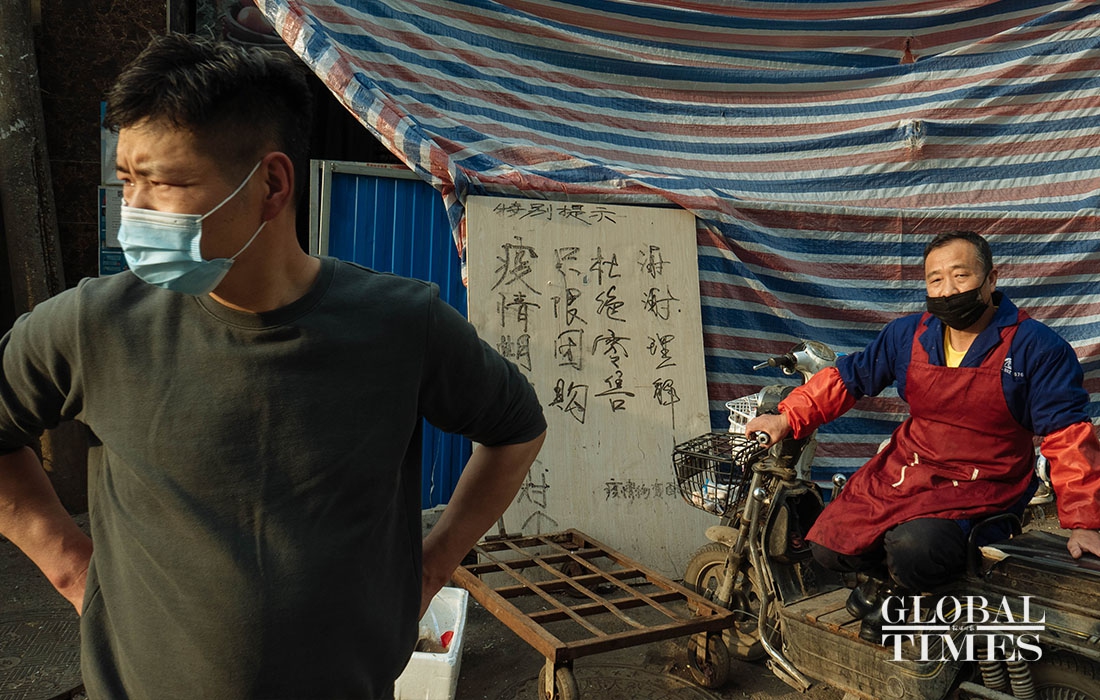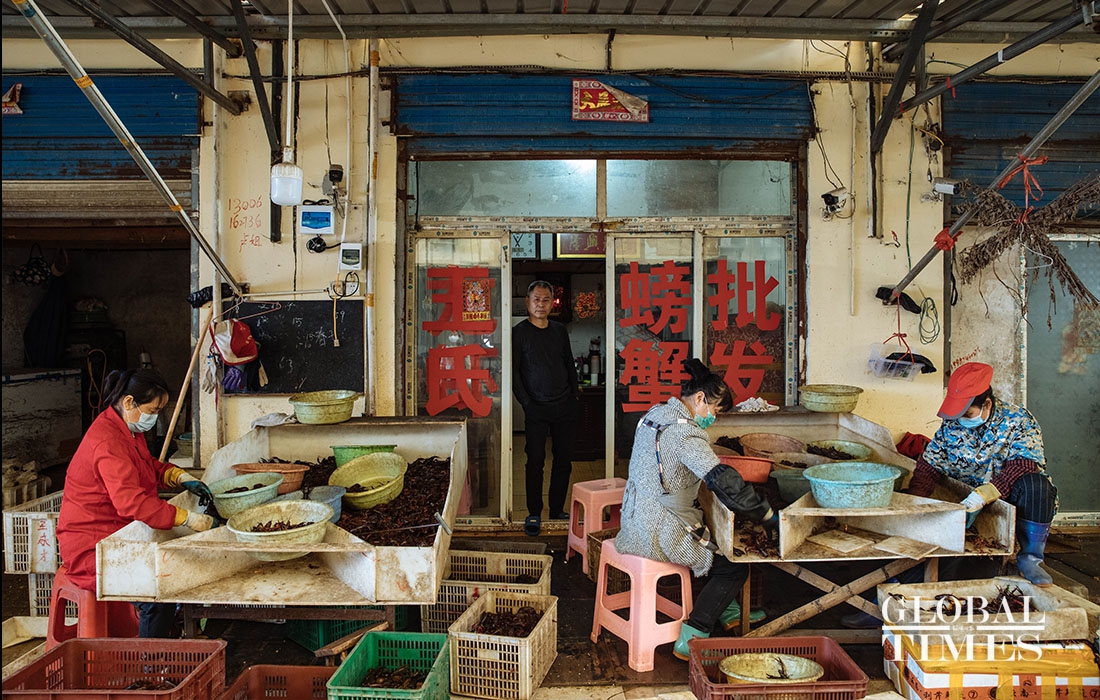 The biggest farm produce market in Wuhan city - the Baishazhou market - has maintained its normal operation throughout the lockdown. After the restrictions were lifted, the Baishazhou market remains busy to welcome its customers and vendors. The Xiaodongmen market in Wuchang district continues to be shut. To sell the produce, vendors hoarded vegetables and meat in front of the closed market entrance and waited for the products to be packaged and delivered. In the Wutaizha market, the business is yet to resume, and currently it is undergoing disinfection drives. According to the manager of the Wutaizha market, the market is waiting for further notice to resume its business. No trade of live fowls is witnessed in the markets that are in operation. Local vendors said there used to be finless eels and soft-shelled turtles, but after the enforcement of a stringent policy, they have all vanished. (Photos: Li Hao/GT)