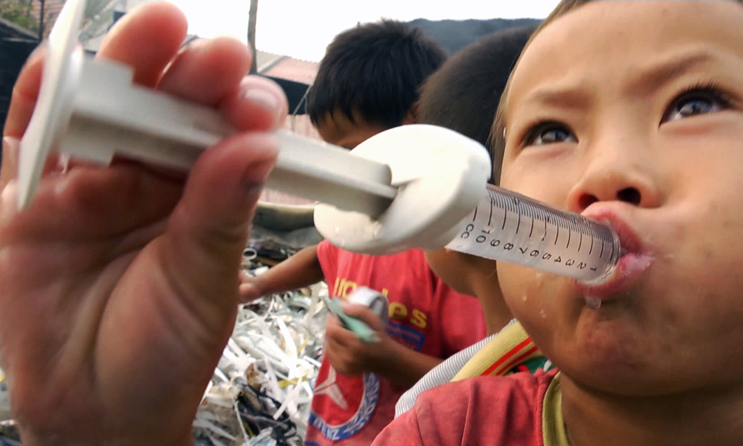 The child of a recycler drinks from of a syringe he found. Medical waste, despite being prohibited from import into China, often ends up in these workshops. Syringes become children’s toys, and the workers even wear used but washed medical gloves for work.