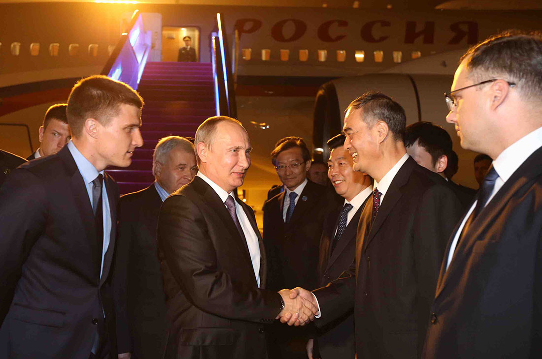 Russian President Vladimir Putin arrives in Hangzhou, September 3, 2016. Aircraft: Ilyushin IL-96 Photo: CFP figcaption >