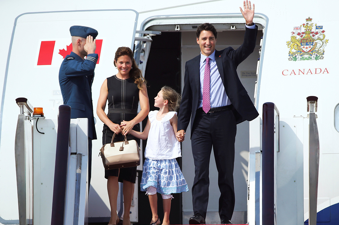 Canadian Prime Minister Justin Trudeau (R), his wife Sophie Gregoire and their daughter Ella-Grace arrive in Hangzhou, September 3, 2016. Aircraft: CC-150 Photo: CFP figcaption >