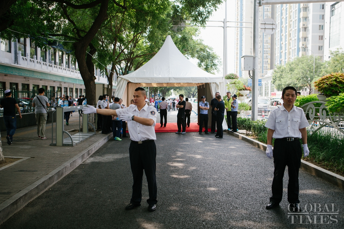 Security guards and police officers maintain order at the Niujie Mosque in Beijing on September 12. Photo: Li Hao/GT figcaption >
