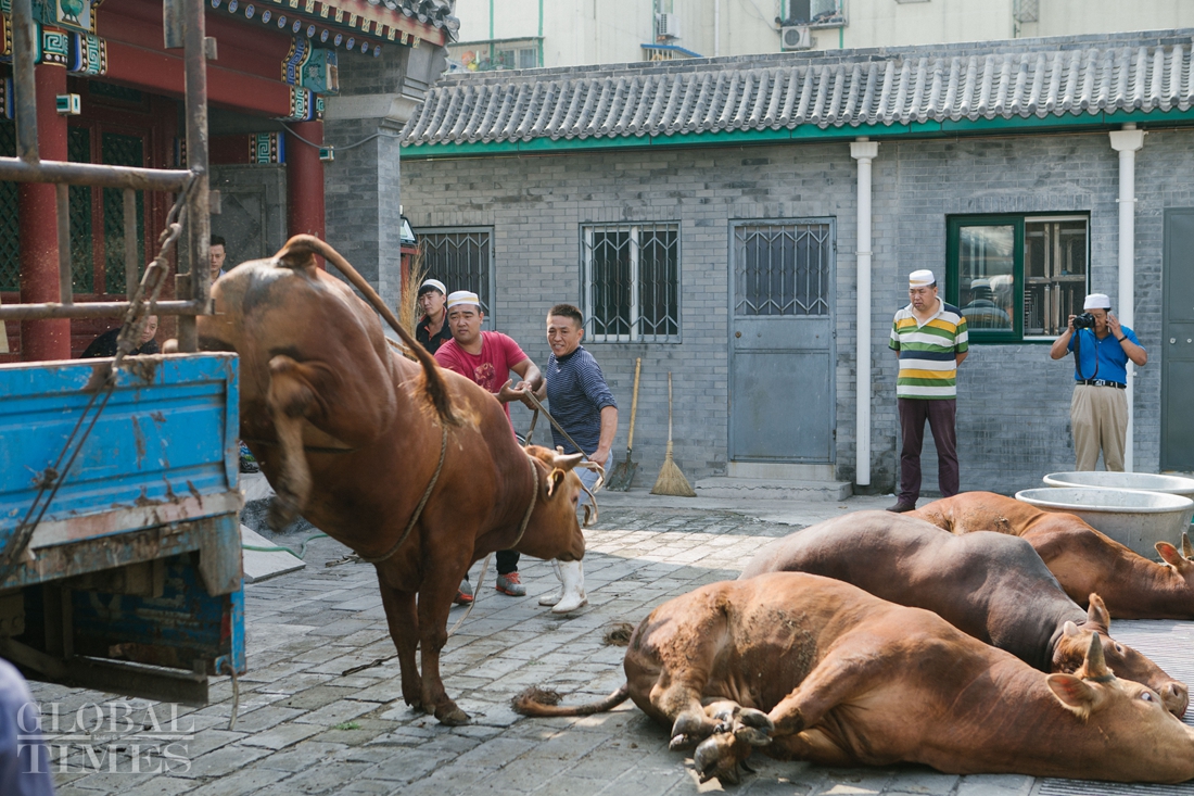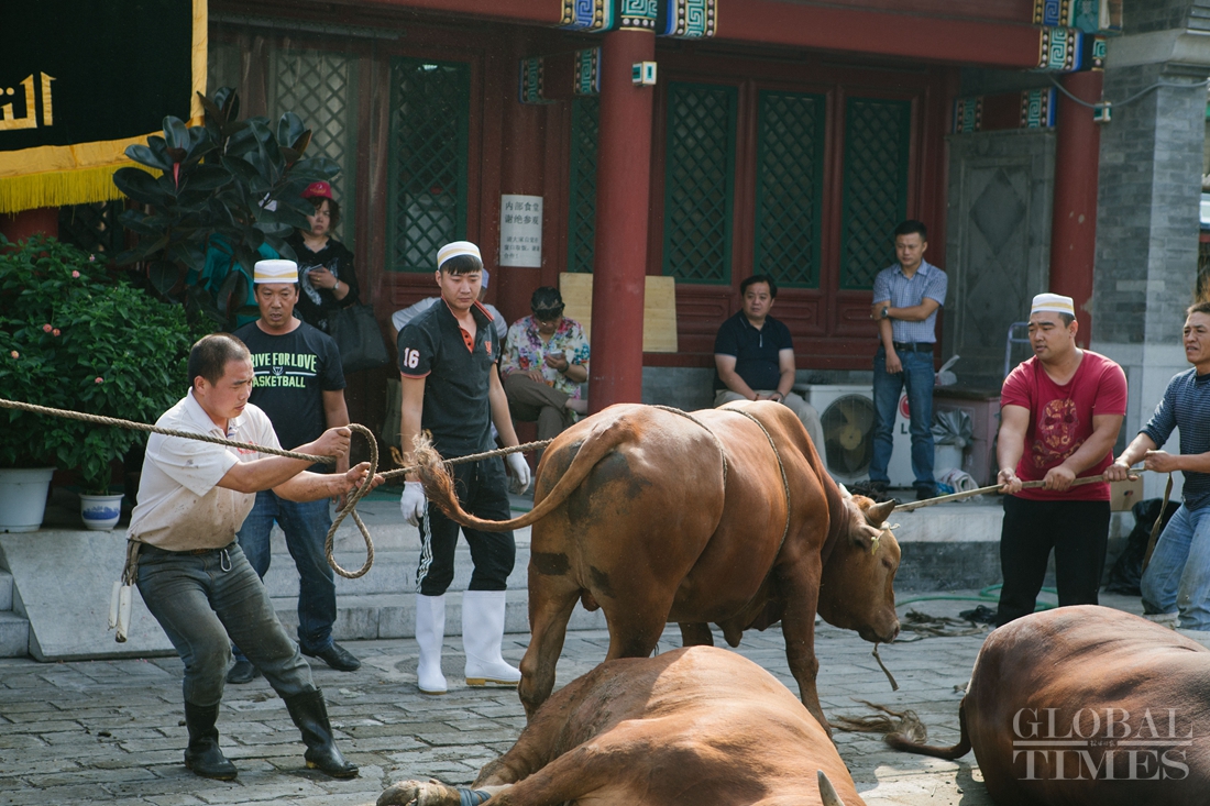 Cattle are prepared for slaughter as part of the Corban Festival celebrations. After the prayer service, the meat from the slaughtered animals will be given to friends, family and those in need. Photo: Li Hao/GT figcaption >
