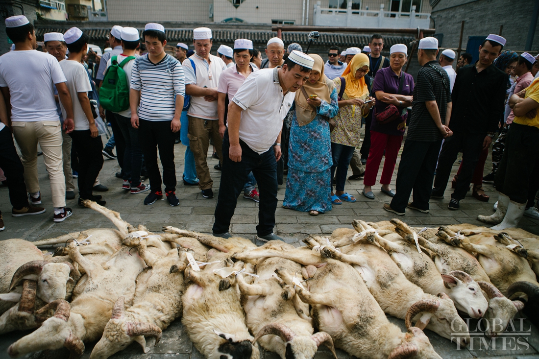 Sheep are prepared for slaughter as part of the Corban Festival celebrations. Photo: Li Hao/GT figcaption >