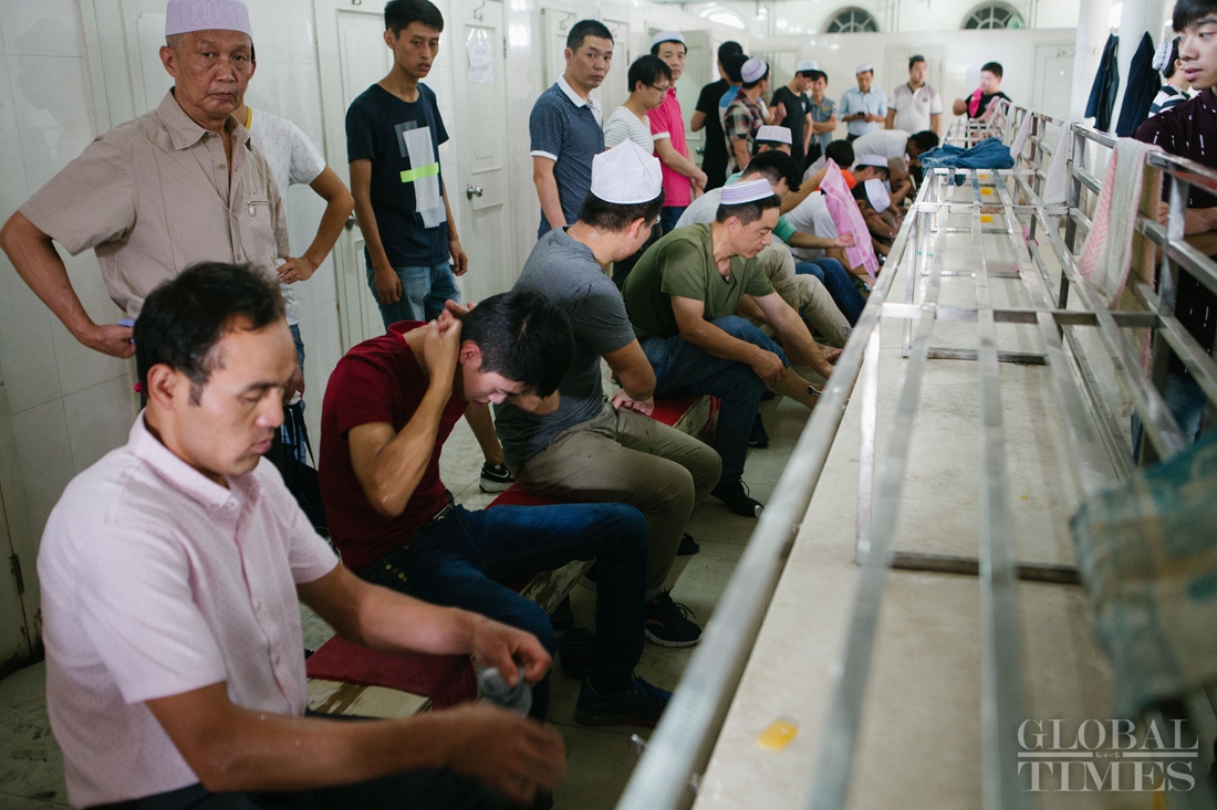 Muslims purify their bodies before attending a prayer service at the Niujie Mosque in Beijing on September 12. Photo: Li Hao/GT figcaption >