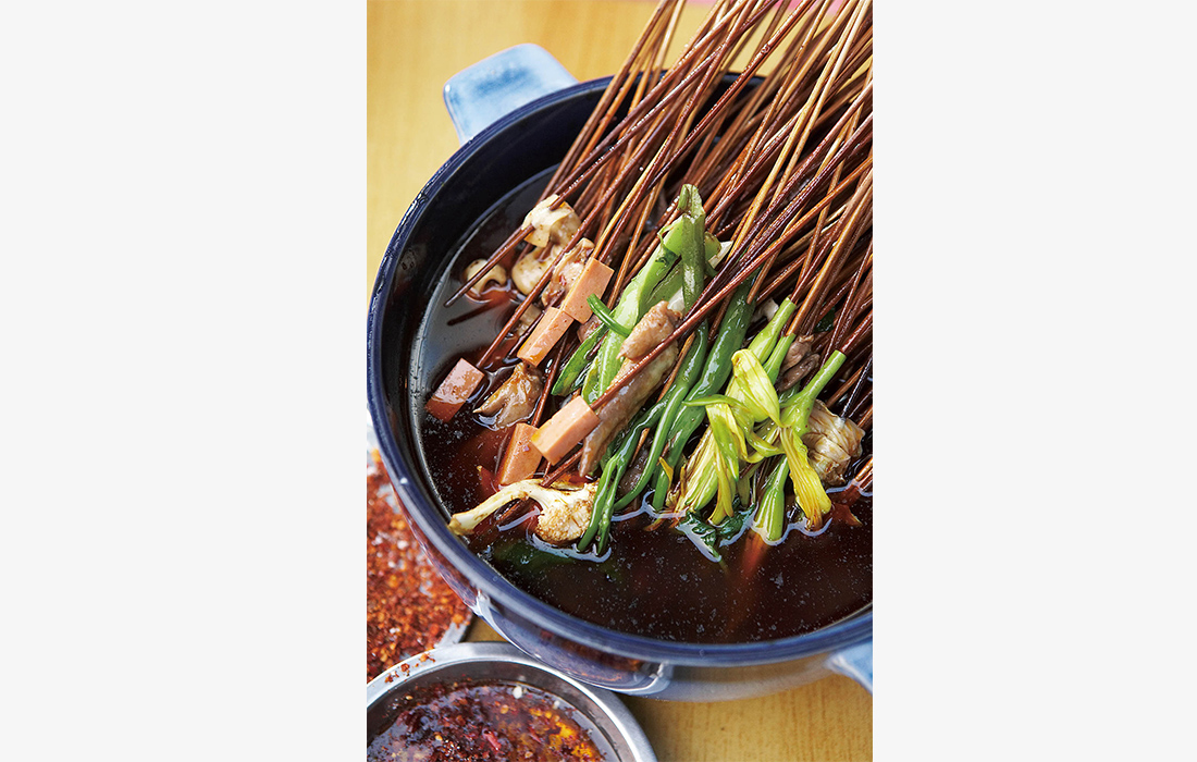 Spicy boiled skewers are popular Sichuan-style snacks that have spread throughout China. Meat and vegetables are sliced into irregular shapes before they are strung together on bamboo sticks and boiled in the spicy soup base. figcaption >