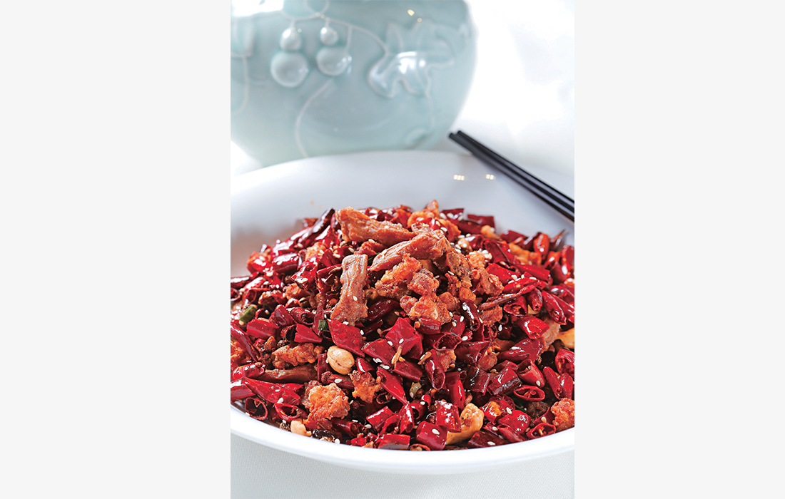 Spicy deep-fried chicken is a dish that looks as good as it tastes. Diced chicken is fried to achieve ideal tenderness, then stir-fried with dried chilies, facing heaven peppers and Sichuan peppercorns resulting in an irresistible flavor. figcaption >