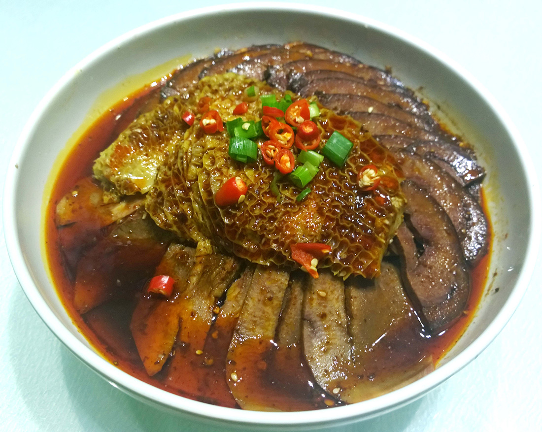 Fuqi feipian, or couple’s sliced beef in chili sauce, is made of thinly sliced tripe dressed with chili oil. The cold dish has an irresistible aroma and delicate taste, which make it an excellent appetizer to enjoy before a main course. figcaption >