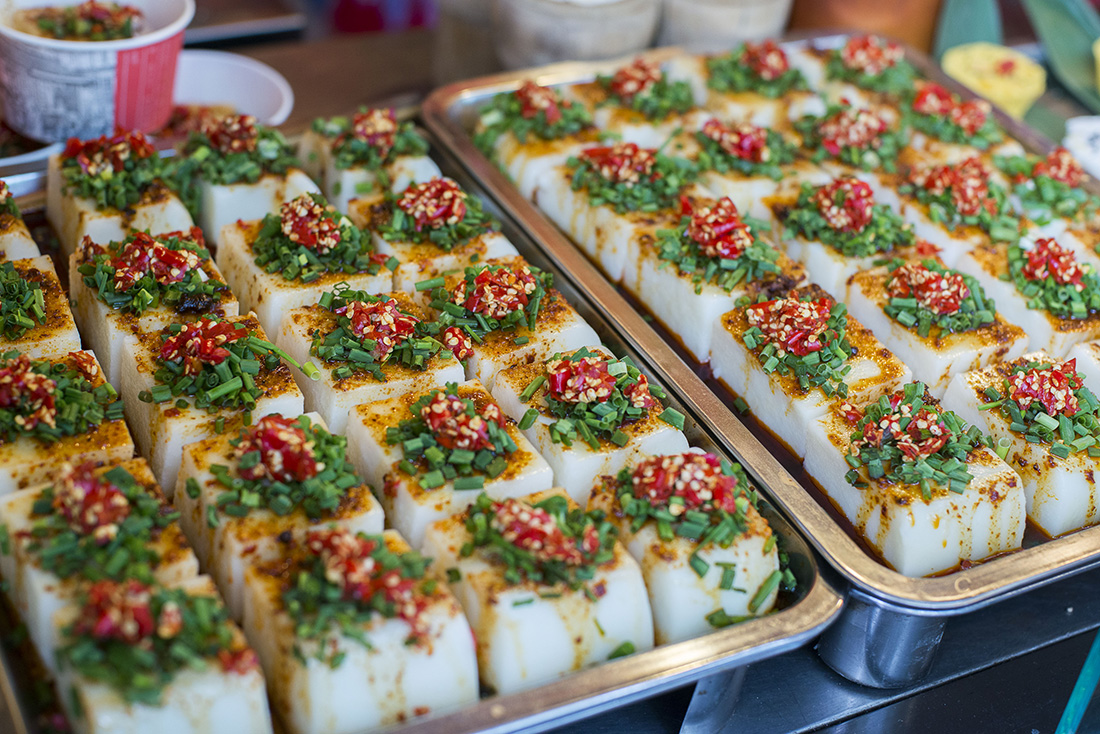 Liang fen, or cold starch jelly in chili sauce, is a popular summer food served with Sichuan-style chili sauce. The street snack is usually made from mung bean starch, which is cut into thick strips before being tossed with soy sauce, vinegar, crushed garlic and chili oil. figcaption >