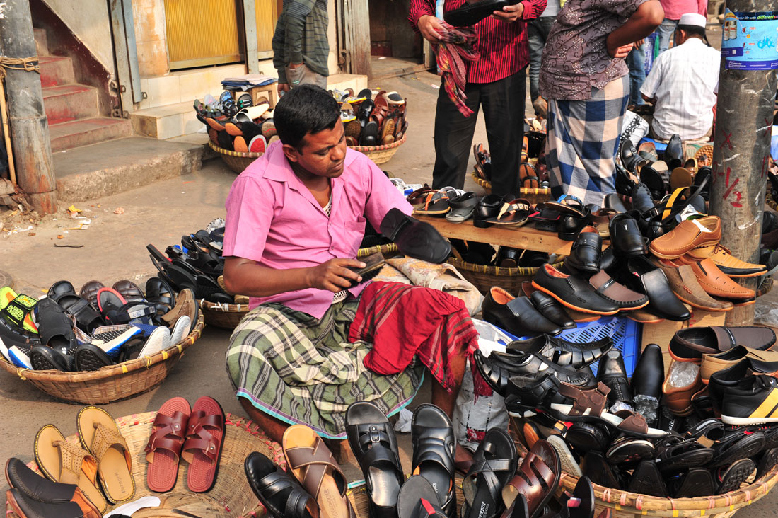 A man sits among several baskets of shoes as he applies polish to a black pair on the streets of Dhaka, Bangladesh, on February 5.