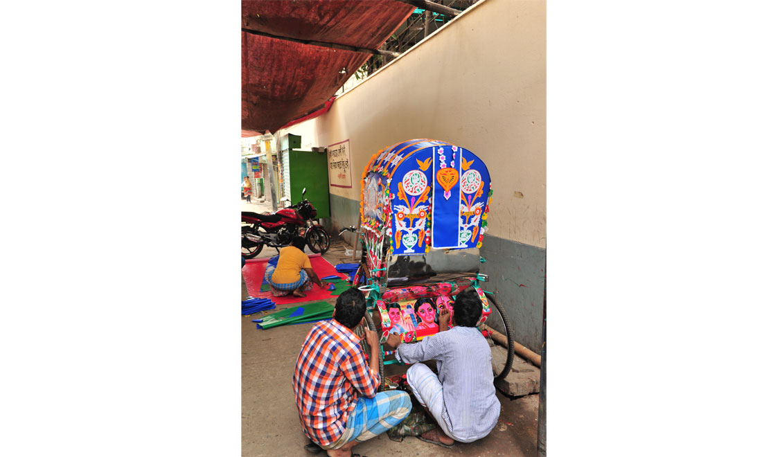 A man paints a tricycle on the streets of Dhaka on February 6. Painting these vehicles takes a keen eye and a steady hand. figcaption >