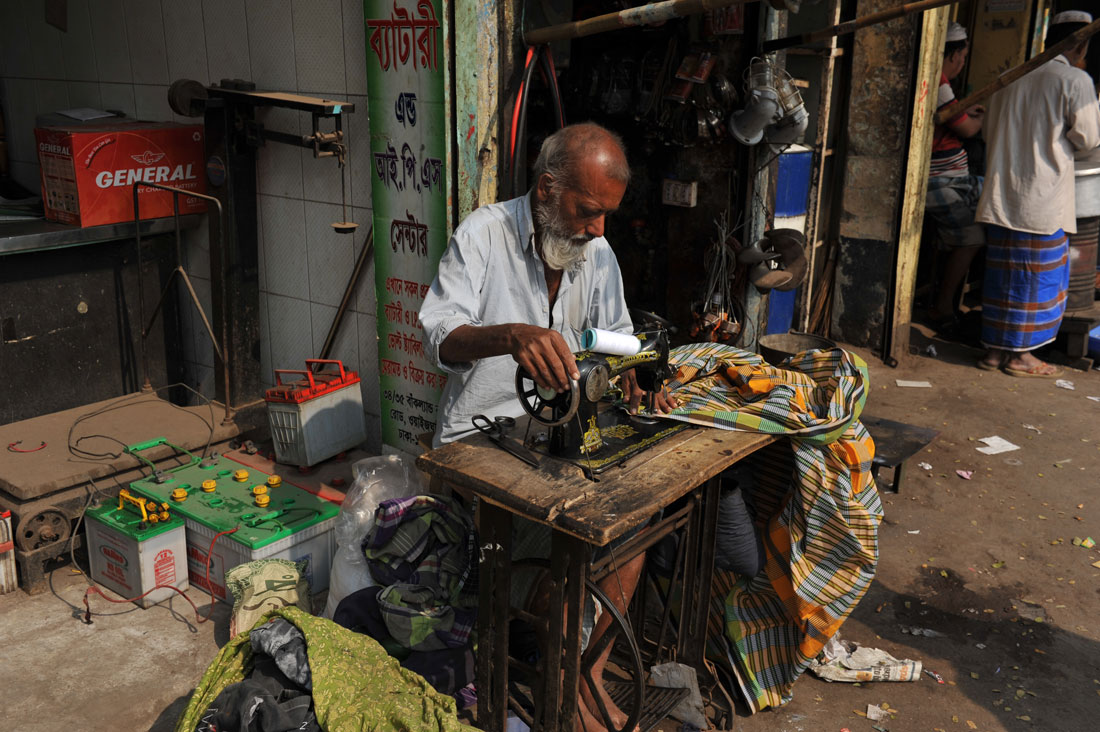 An elderly man mends a garment with the help of a sewing machine on the streets of Dhaka, Bangladesh, on February 5. Photos: Courtesy of Cheng Meng