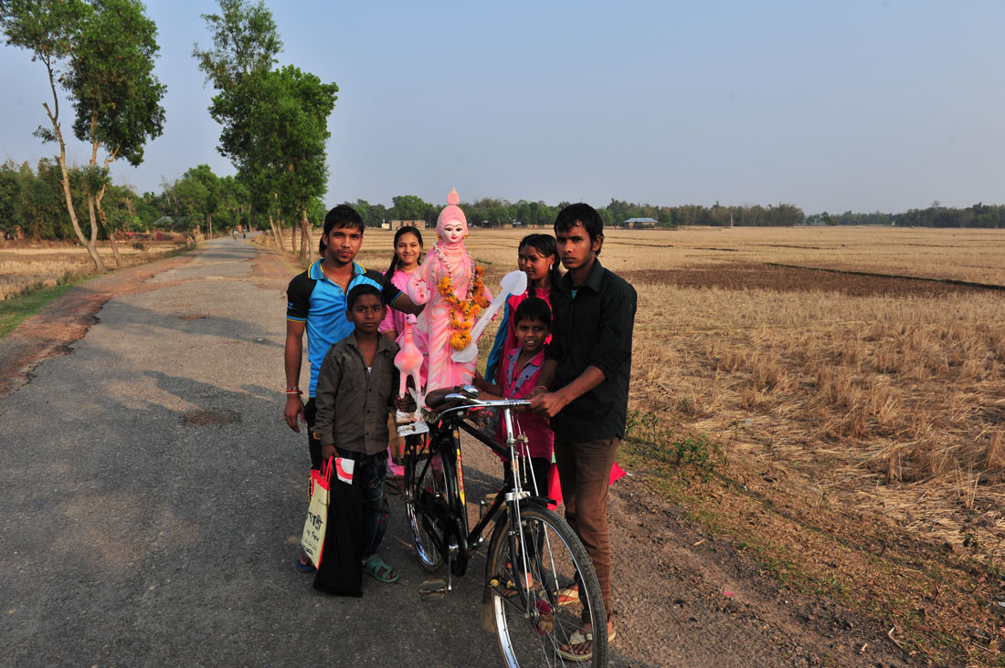 A statute of a goddess is transported home on a bicycle by a group of family members in Srimangal on February 14. figcaption >