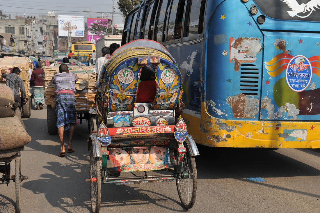 A colorful tricycle on the streets of Dhaka on February 6. These vehicles, featuring custom paint jobs, are a key form of transport in the city. figcaption >