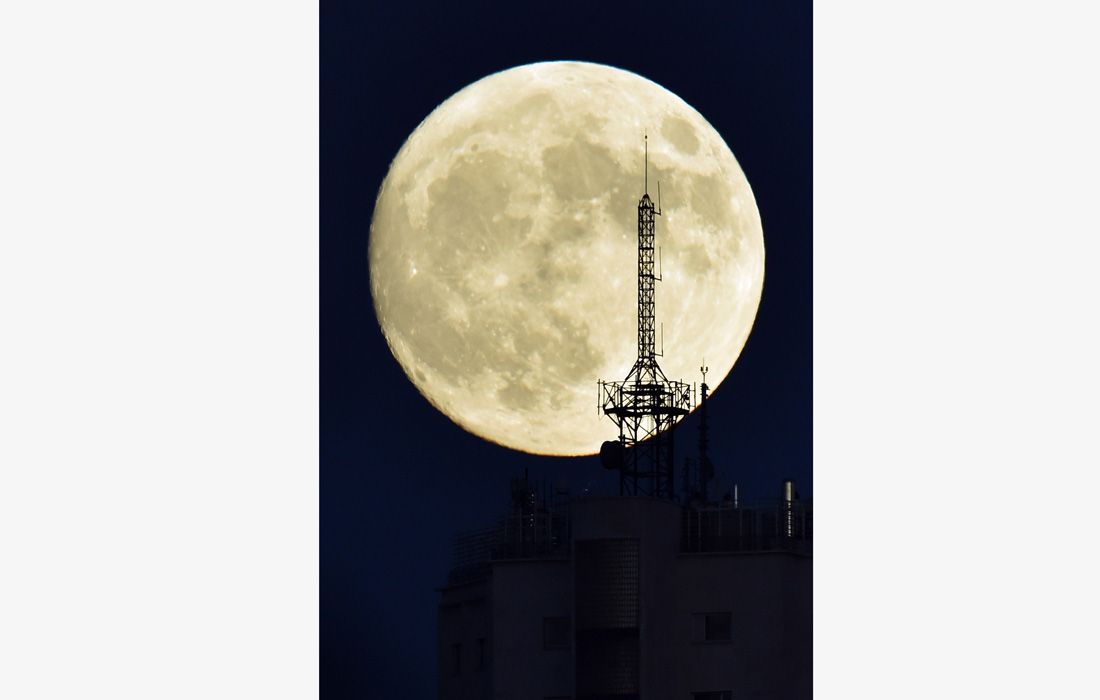 The moon rises over an antenna on the top of a building in Madrid on November 13, 2016, on the eve of a "supermoon". On November 14, 2016, the moon will orbit closer to the earth than at any time since 1948, named a 'supermoon', it is defined by a Full or New moon coinciding with the moon's closest approach to the Earth. Photo: CFP/GERARD JULIEN figcaption >