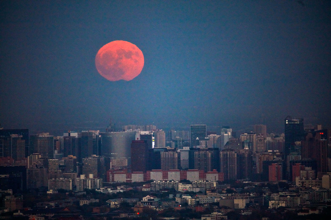 The “supermoon” is seen behind a building in Beijing, China, November 14, 2016. The spectacle won’t happen for another 18 years. Photo: CFP figcaption >