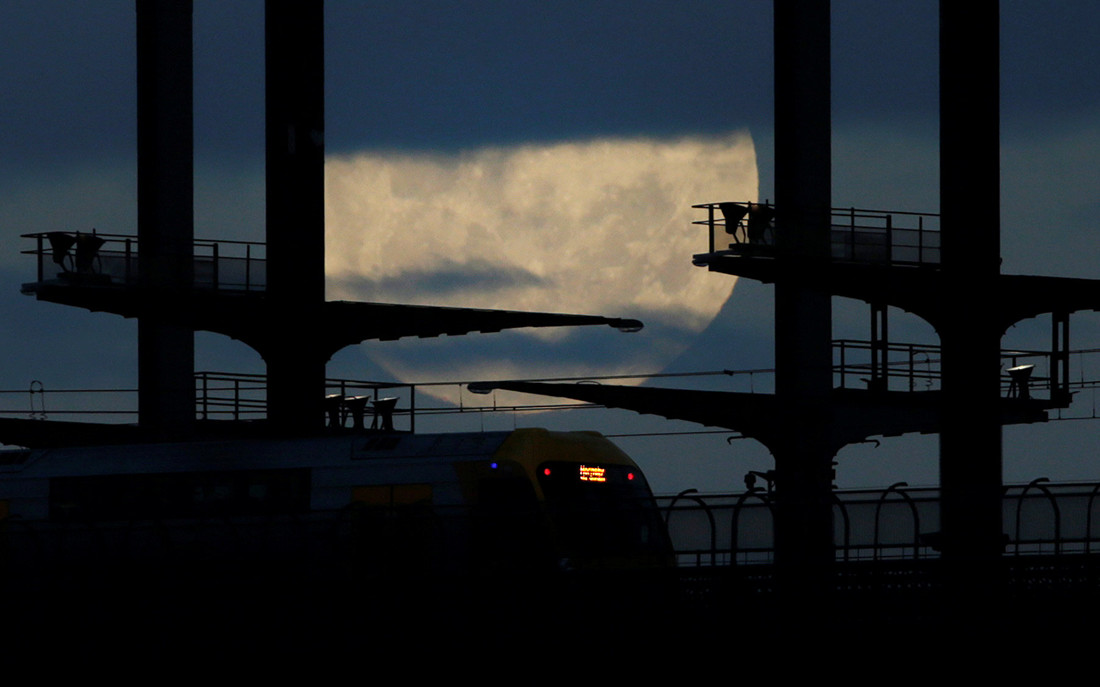 The moon rises behind a car on The Emirates Air Line (cable car) in London's Docklands on November 13, 2016.On November 14, The moon will orbit closer to the earth than at any time since 1948, named a 'supermoon', it is defined by a Full or New moon coinciding with the moon's closest approach to the Earth. Photo: CFP/Glyn KIRK figcaption >