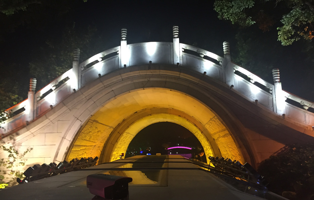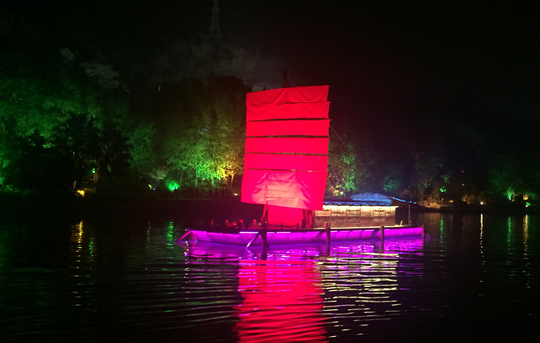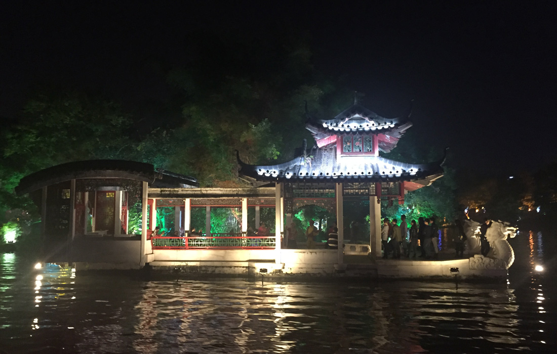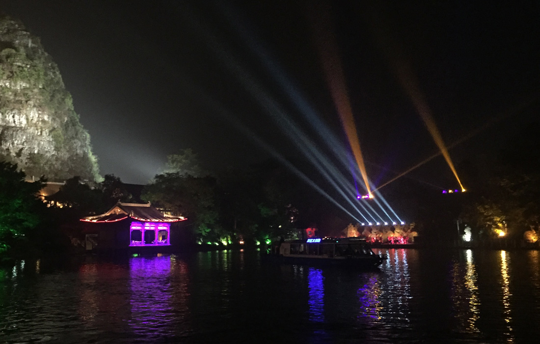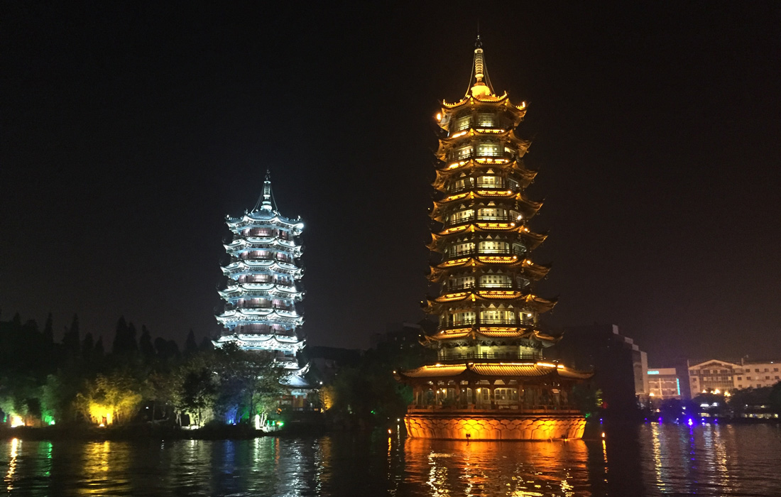 The Sun and Moon Pagodas are lit up at night on November 16. Taking a night cruise through the Two Rivers and Four Lakes scenic spot is a favorite activity for visitors to Guilin. The area includes both the Lijiang and Taohua rivers, as well as the Mulong, Guihu, Ronghu and Shanhu lakes. Photo: Jin Jianyu/GT figcaption >