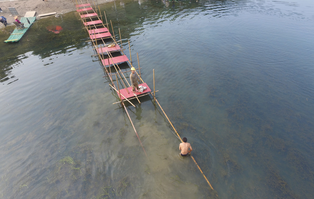 Workers construct a bridge across a river in Xiangshan Park. Photo: Courtesy of Wang Jing figcaption >