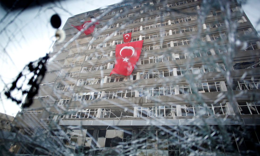 July: The Ankara police headquarters is seen through a car’s broken window caused by fighting during a coup attempt in Ankara, Turkey on July 19. During the unsucessful coup, over 300 people were killed and more than 2,100 were injured. Photo:CFP figcaption >