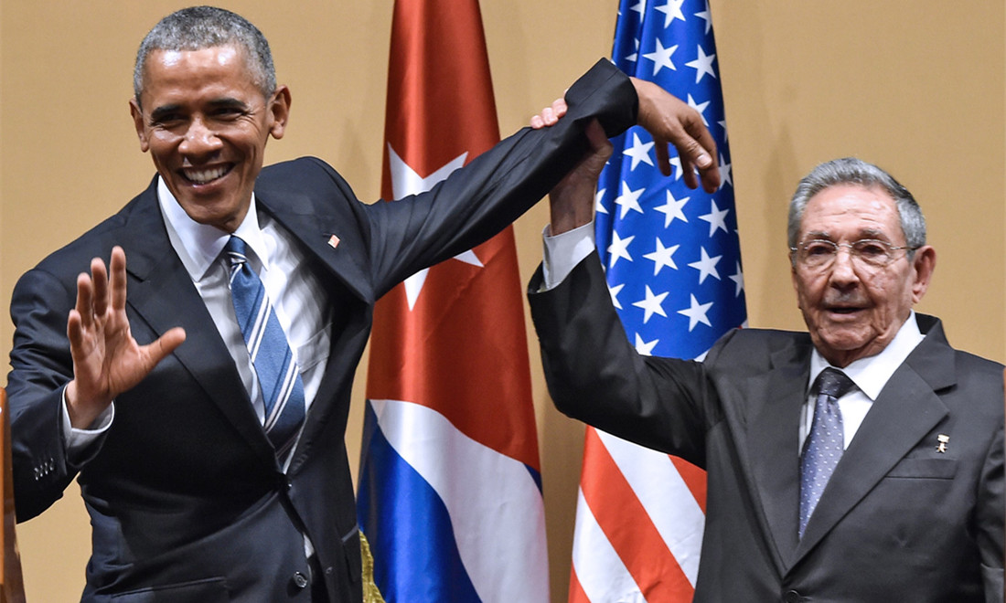 March: Cuban President Raul Castro (right) raises US President Barack Obama’s hand during a meeting at the Revolution Palace in Havana on March 21, as diplomatic ties between the two countries resumed for the first time since the Cold War. Photo:CFP figcaption >
