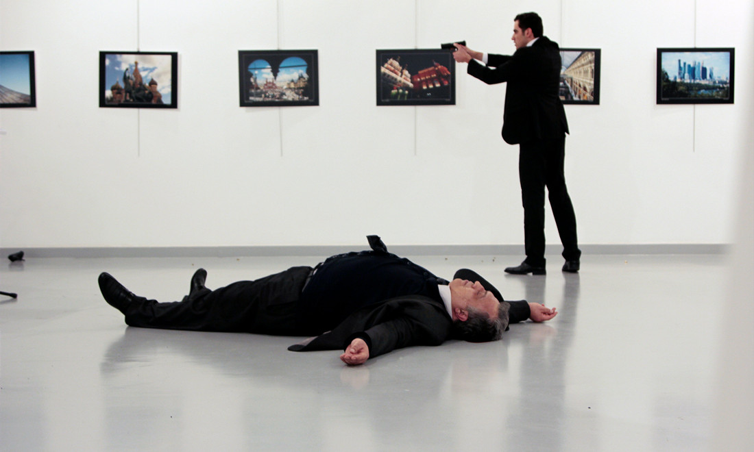 December: Russian Ambassador to Turkey Andrei Karlov lies on the ground after he was shot while making a speech at an art gallery in Ankara on December 19. The assassin, Mevlüt Mert Altinta, an off-duty Turkish policeman, was also killed at the scene. Photo: CFP figcaption >