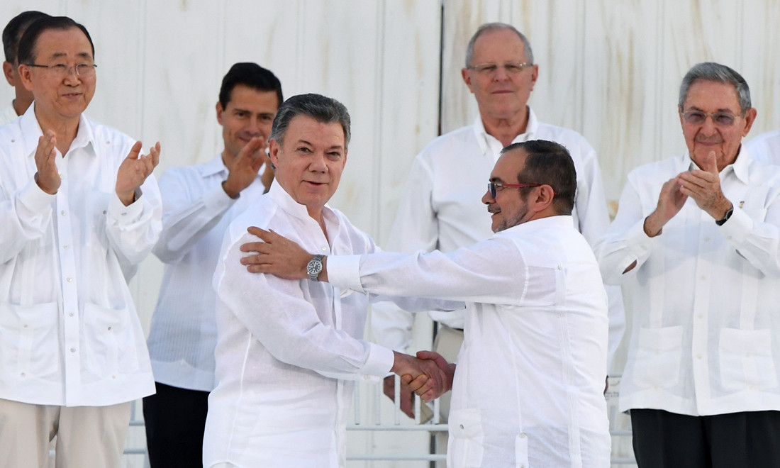September: Colombian President Juan Manuel Santos (center left) and the head of the Revolutionary Armed Forces of Colombia (FARC) guerrilla Timoleon Jimenez, aka Timochenko, shake hands during the signing of the historic peace agreement between the Colombian government and FARC, in Cartagena, Colombia, on September 26. The peace deal brings the country’s more-than-50-year-long civil war to an end, which has cost the lives of at least 220,000 Colombians. Photo:CFP figcaption >