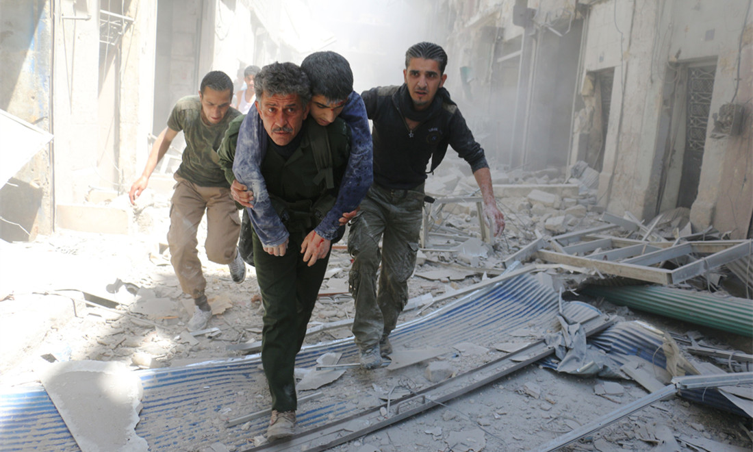 April: Syrians evacuate an injured man amid the rubble of destroyed buildings following an airstrike on a rebel-held neighborhood in Aleppo, on April 29. By the end of the year, most civilians had fled, and the government said it has taken control of the city. Photo:CFP figcaption >
