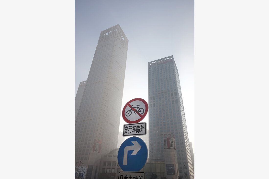 Skyscrapers stand in the heavily polluted Beijing air with their uppermost floors piercing through into blue skies high above on January 2, 2016. Beijing South Railway Station is the terminal station of the blackened high-speed train. figcaption >