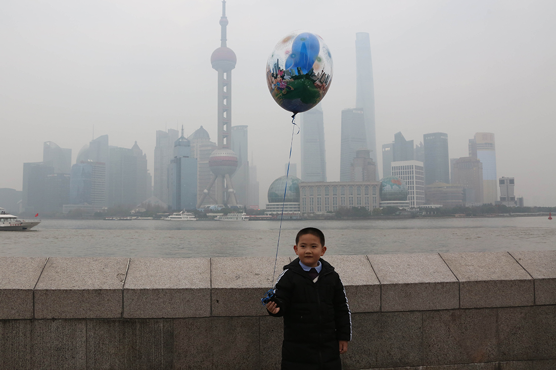 A boy poses with a balloon in the heavily polluted air of Shanghai’s Pudong New Area on January 2, 2016. Shanghai Hongqiao Railway Station is the point of departure for the blackened high-speed train. figcaption >