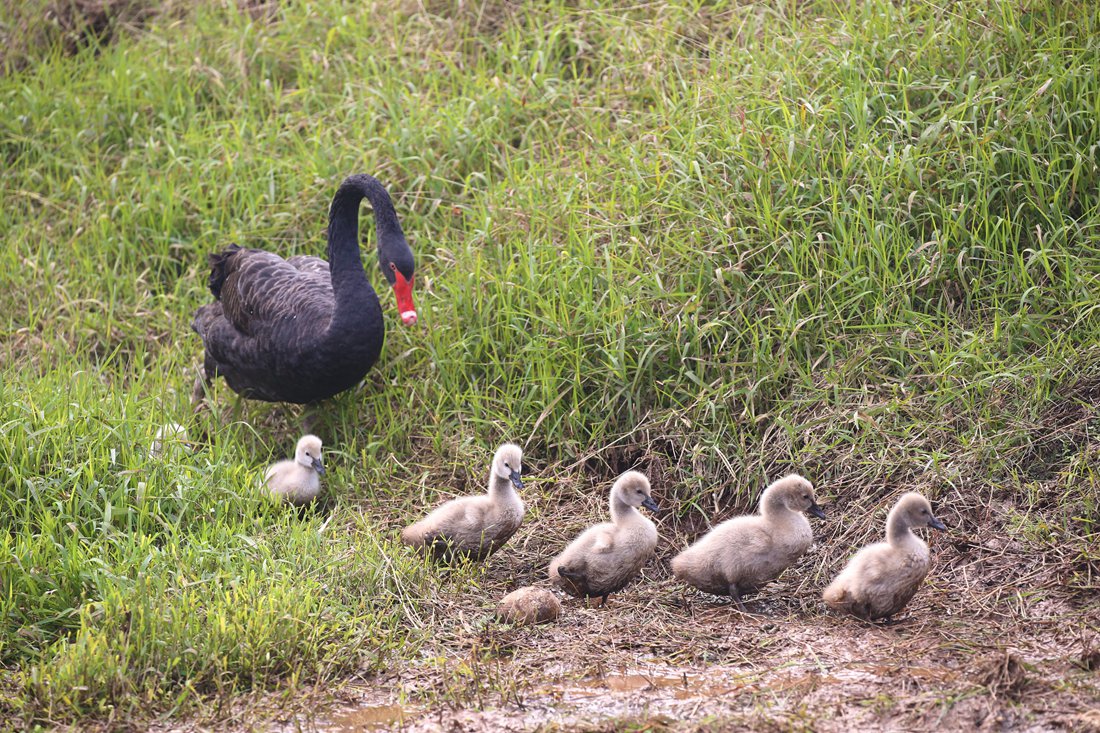 Several newborn cygnets learn to walk as their mother follows close behind at an animal park in Chongqing, Southwest China on January 15, 2017. Photo: CFP