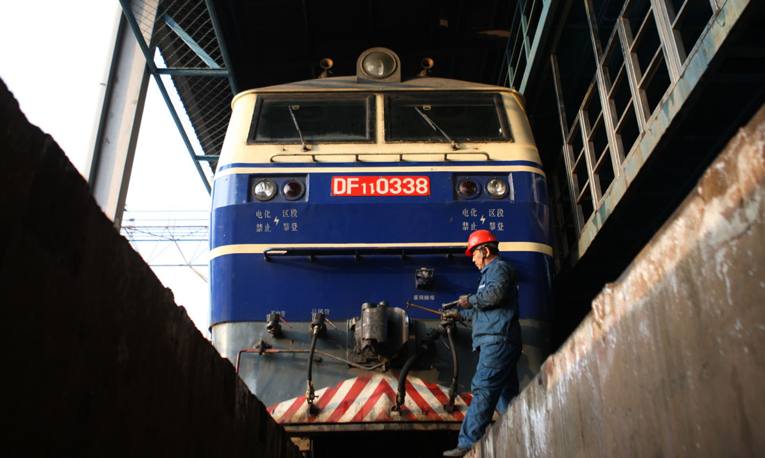 Cao double-checks the head of a train on January 15. Photo: CFP figcaption >