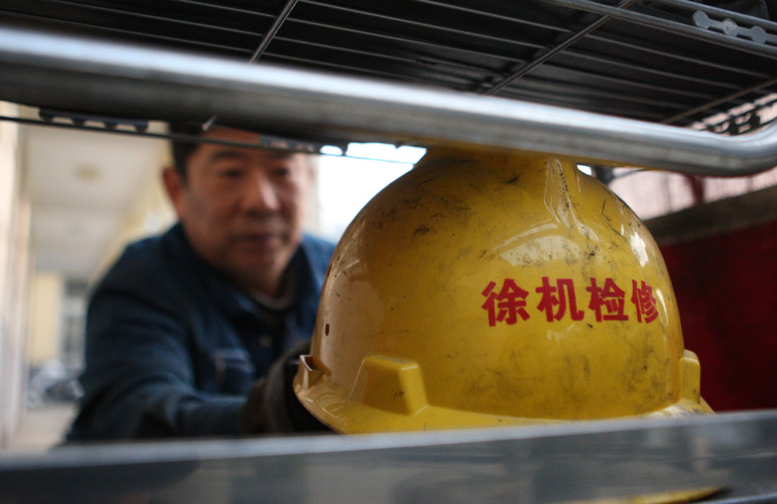 Cao reaches for his safety helmet, which has accompanied him for more than 30 years on the