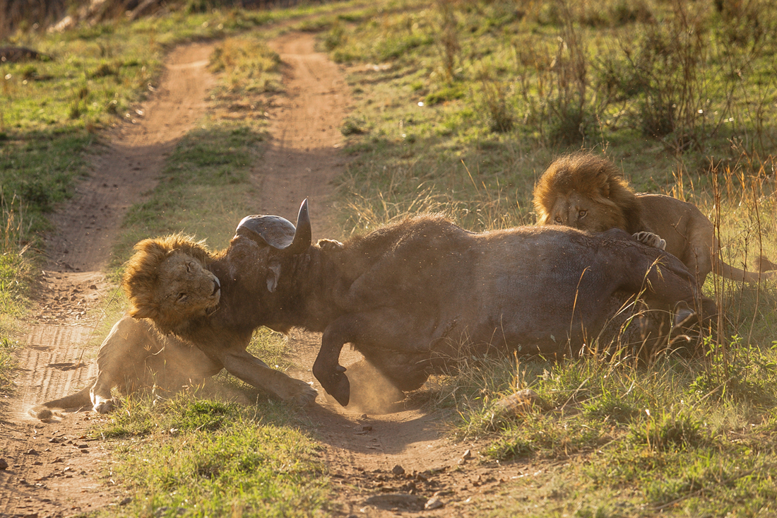 Two lions attack a buffalo in the Serengeti, Africa on October 19, 2016. Photos: Moritz Stragholz / Barcroft Images/CFP figcaption >