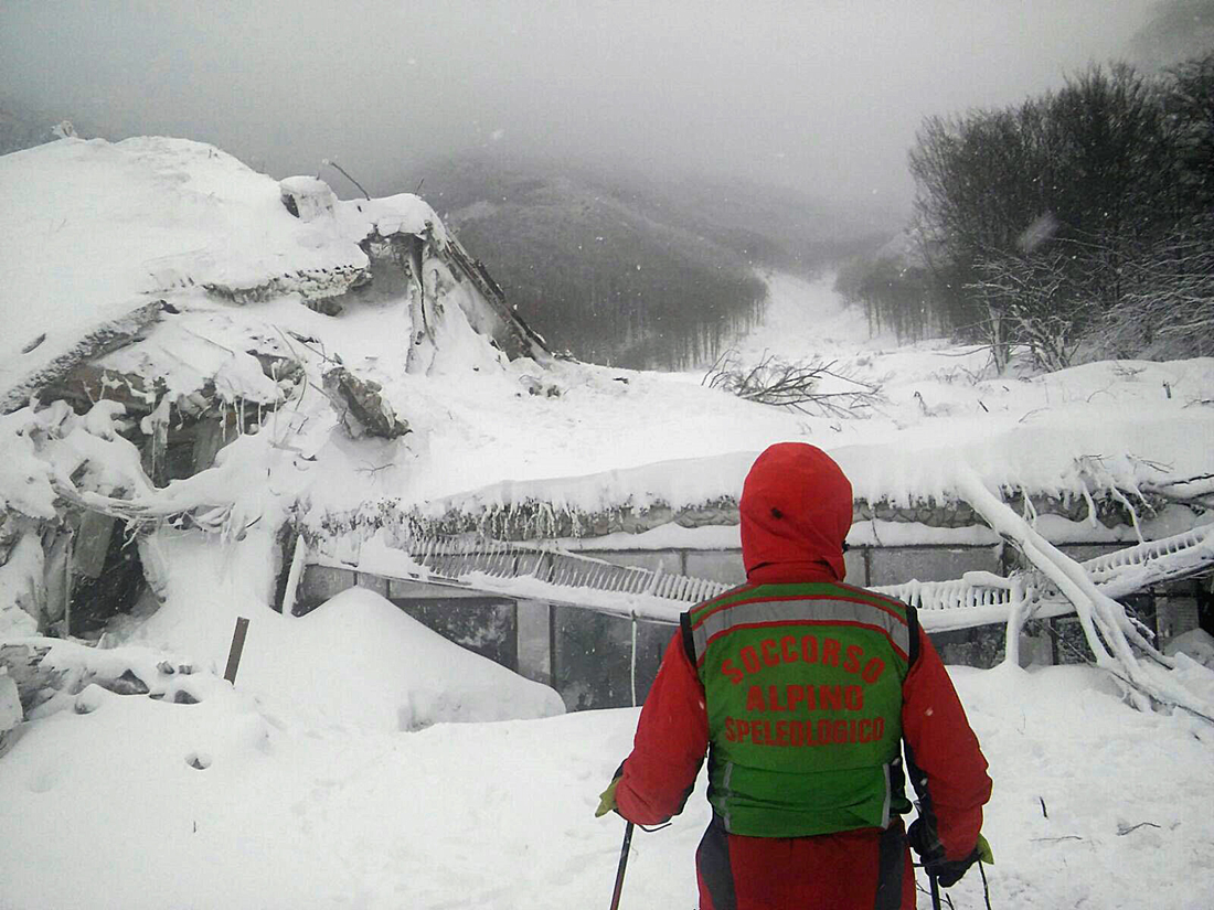 A rescuer stands in front of the Hotel Rigopiano engulfed by a powerful avalanche after a 5.7-magnitude earthquake struck the region on January 19, 2017. Photo: CFP figcaption >