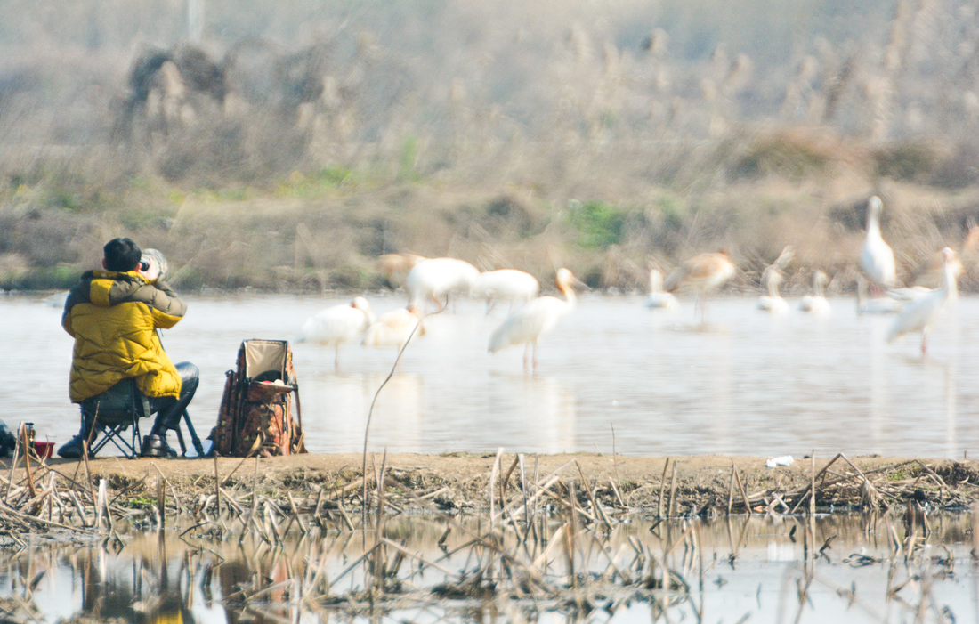 A birdwatcher views white cranes from the shore of China's Poyang Lake in Nanchang, capital of East China's Jiangxi Province on January 21, 2017. Photo: CFP figcaption >