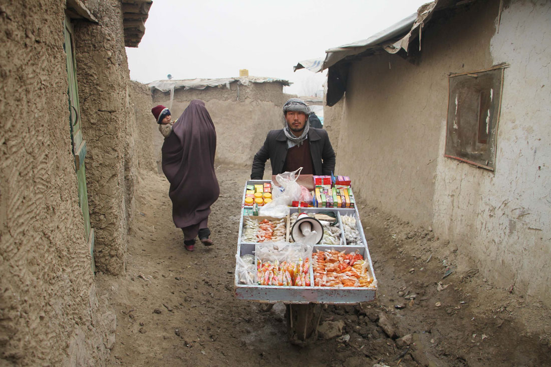 A vendor, pushing his cart full of snacks, walks through the muddy streets of a refugee camp