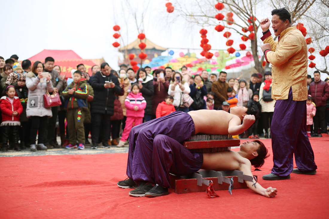 Chinese folk acrobats lie down on beds of nails and knives at a temple fair in Kaifeng, Central China's Henan Province. Photo: CFP figcaption >