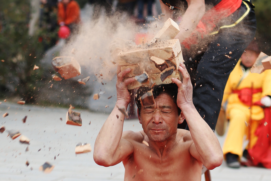 A Chinese folk acrobat has bricks crushed on his head at a temple fair in Kaifeng, Central China's Henan Province. Photo: CFP figcaption >