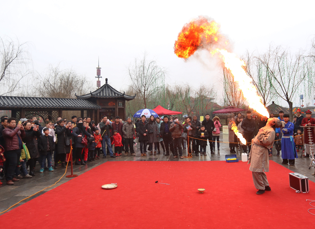 A Chinese folk acrobat shows off his fire breathing skills at a temple fair in Kaifeng, Central China's Henan Province.Photo: CFP figcaption >