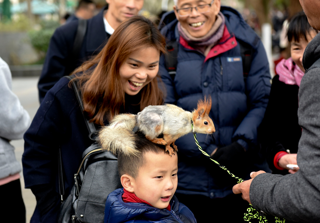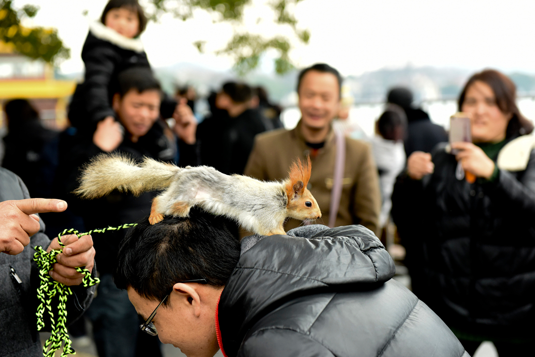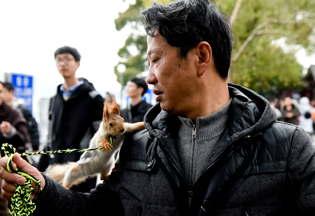 A squirrel lover trains his pet at the West Lake in Hangzhou, capital of Zhejiang Province on February 2, 2017. The tiny 3-year-old critter attracted big smiles from the many visitors at the popular tourist spot. Photos: CFP