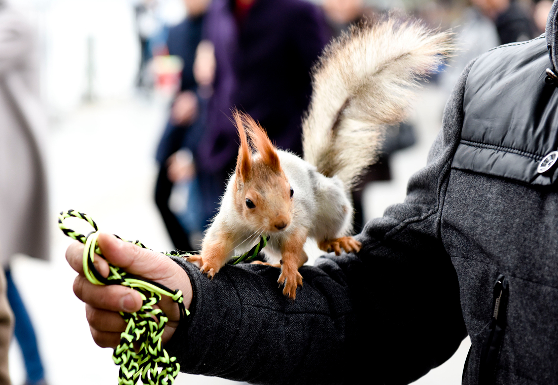 The 3-year-old pet squirrel sits on the arm of its owner at the West Lake in Hangzhou, capital of Zhejiang Province on February 2, 2017. Photo: CFP figcaption >
