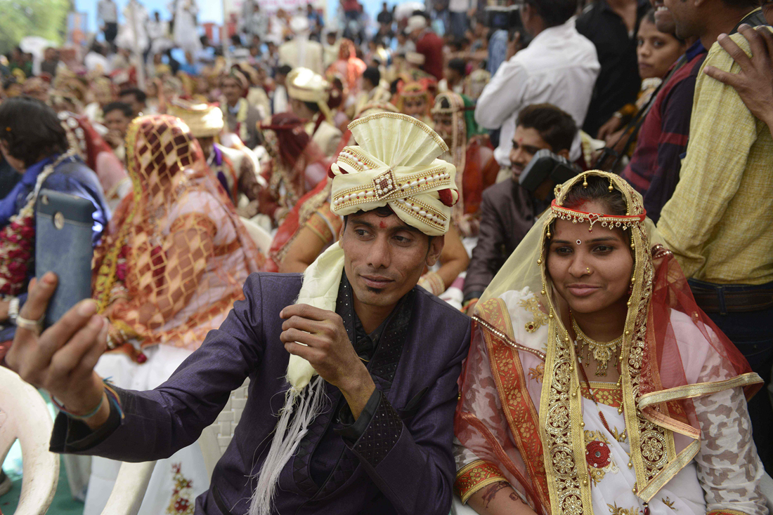 A groom takes selfie with his bride during a mass wedding ceremony on the outskirts of Ahmedabad, India on February 5, 2017. Photo: CFP figcaption >