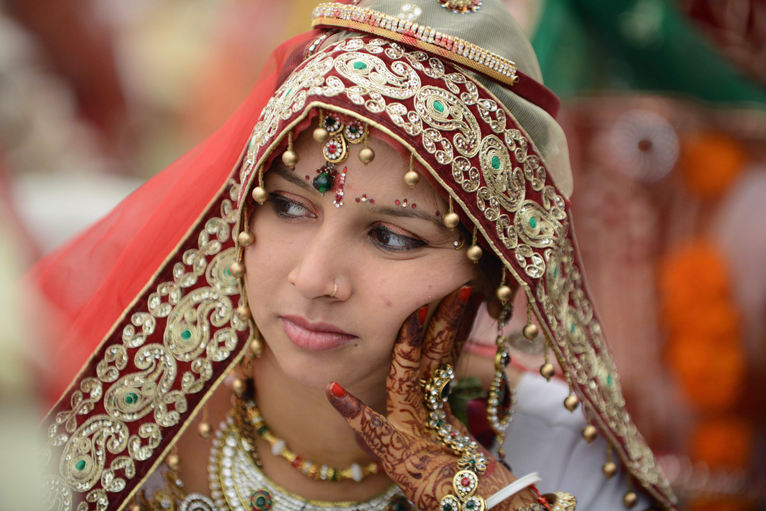 Indian couples in traditional outfits take part in a mass wedding ceremony on the outskirts of Ahmedabad, India on February 5, 2017. Photo: CFP figcaption >