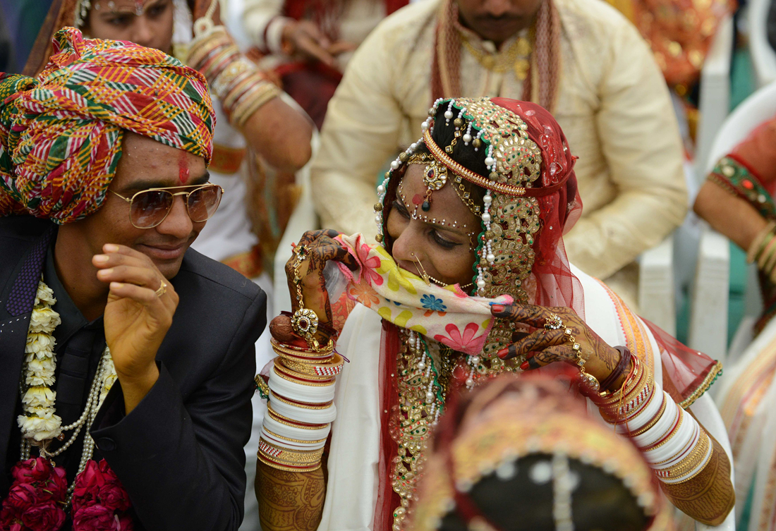 A bride talks with her groom during a mass wedding ceremony on the outskirts of Ahmedabad, India on February 5, 2017. Photo: CFP figcaption >