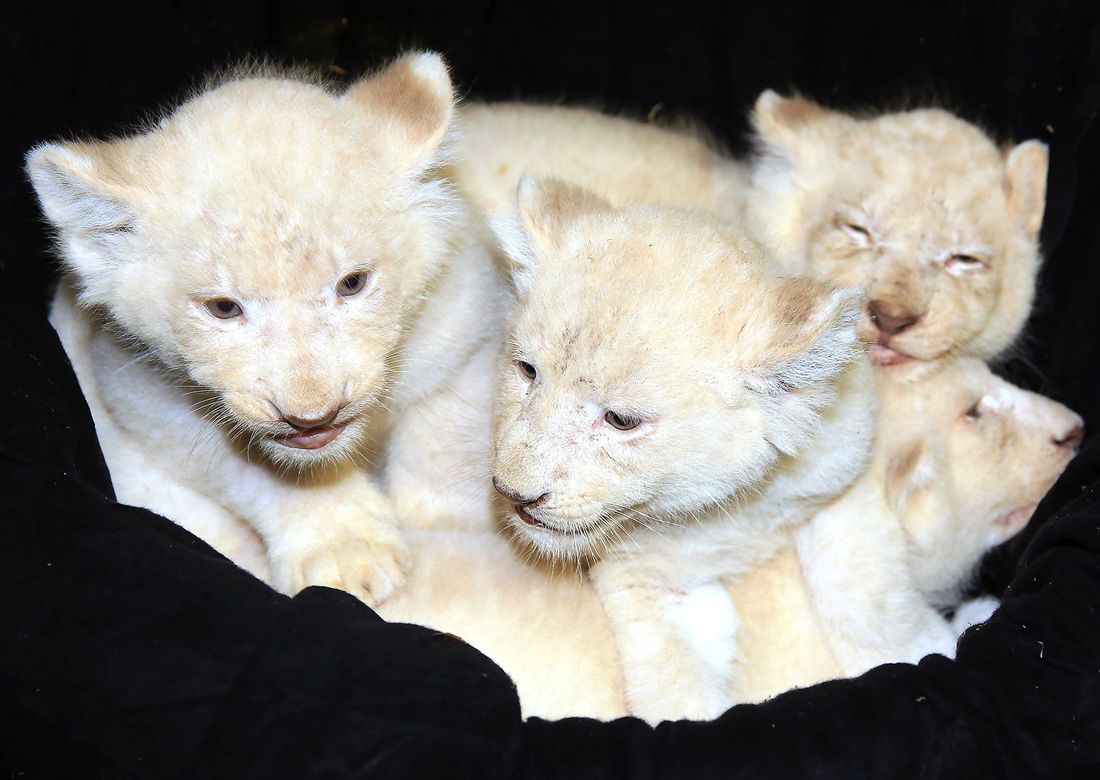 Pictured are newborn white lion cubs at the zoo in Magdeburg, eastern Germany, on February 06, 2017. figcaption >