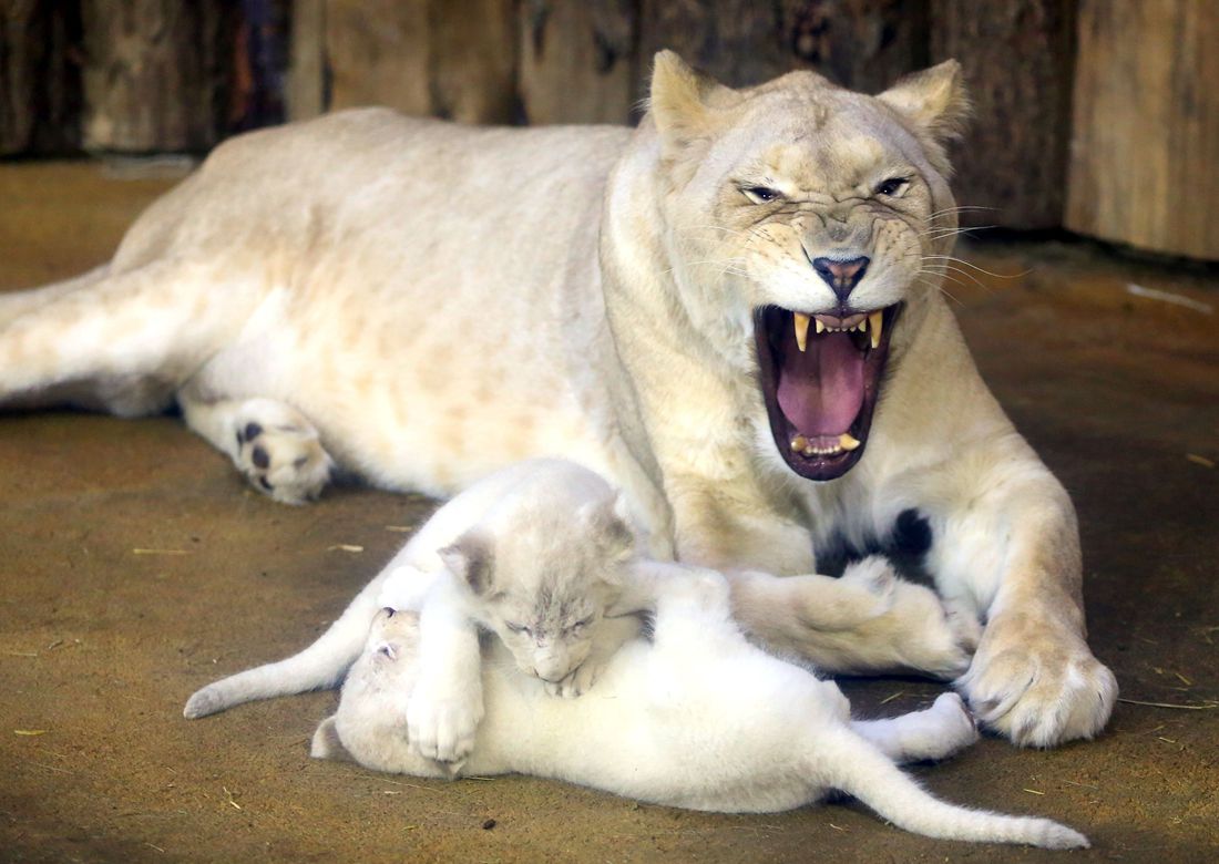 Two newborn white lion cubs play with their mother Kiara at the zoo in Magdeburg, eastern Germany, on February 06, 2017.