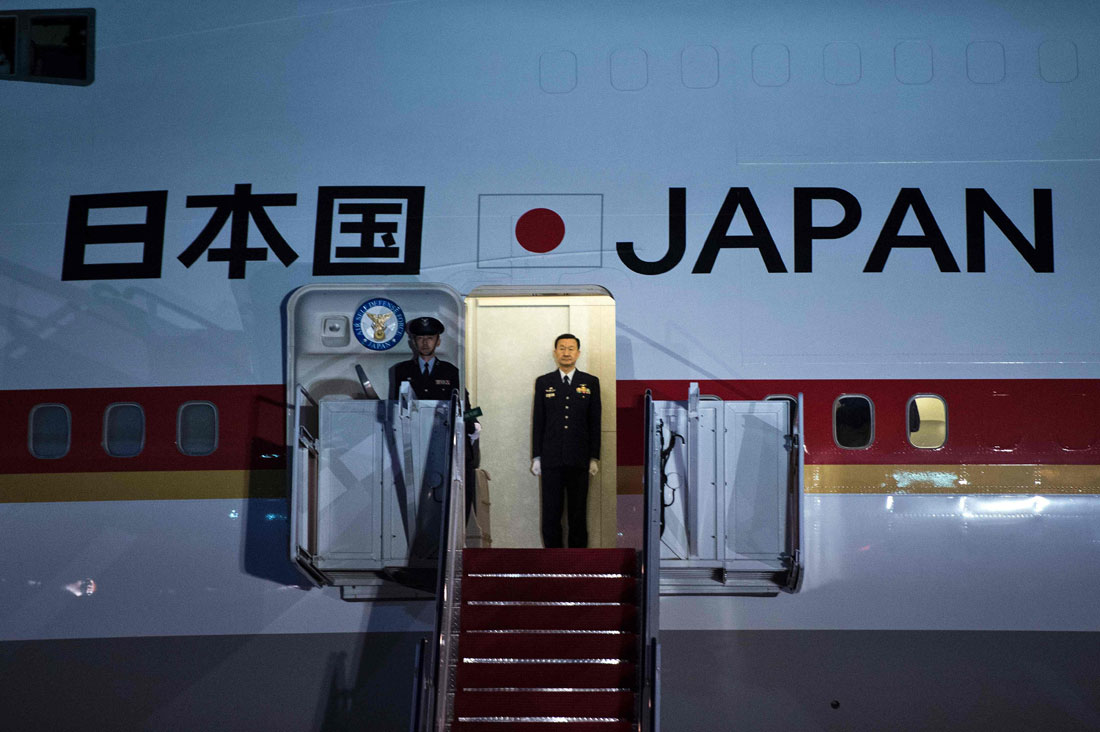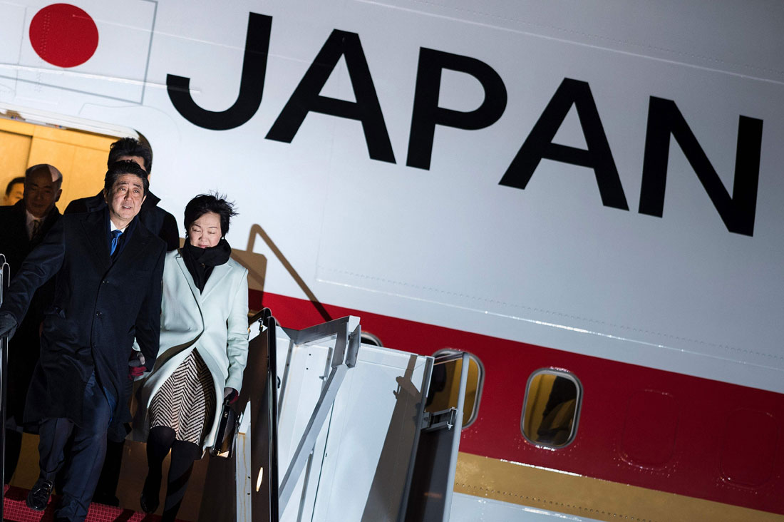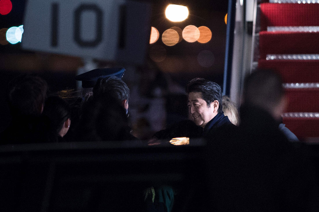 Japanese Prime Minister Shinzo Abe arrives at Andrews Air Force Base in Maryland, US on February 9, 2017. Photo: Brendan Smialowsk/CFP figcaption >