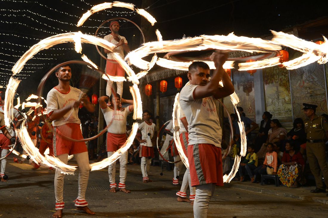 Sri Lankan fire dancers perform in a procession in front of the Gangaramaya Temple during the Navam Perahera festival in Colombo on February 9, 2017. Photo: Lakruwan Wanniarachchi/CFP figcaption >